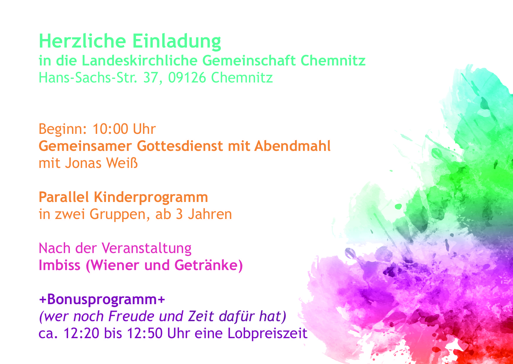An diesem Sonntag findet Keine Gemeinschaftsstunde in Jahnsdorf statt.