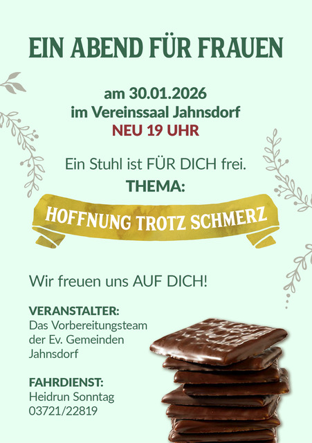 Herzliche Einladung zum "After Eight Abend" für alle Frauen von Jahnsdorf im Vereinssaal Jahnsdorf am 30. Januar 19:00 Uhr